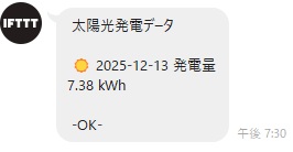 いよいよ「太陽光発電、 通知メールがなくなる」。さてどうしようか、2025/12/07時点で、一番下に添付したメールが朝9:00ころに届いている。これを、代替できるLINE通知する仕組みを作ってみました。 12/14に取得した結果は次の通り、ほぼ同じ結果で十分な結果と言えるでしょう。