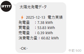 AM9:00に前日の発電量・売電量・買電量・消費電力を通知