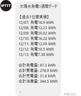 日曜日 AM9:00に前日までの7日間の発電量・売電量・買電量・消費電力を通知