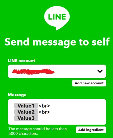 THAT(実行内容)に LINEの「Send message to self」を選択し、自分のLINE accountを設定します。 Messageは、上のように設定すれば、設定完了です。